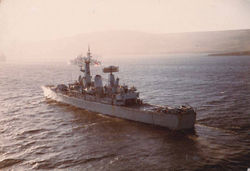 In 1982, Penelope took part in the Falklands War as part of the "Bristol group", which included two other Leander-class ships - Minerva and Andromeda - Upon her arrival, Penelope mainly performed escort duties, including escorting the damagedArgonaut in late May, who had suffered damage after being hit by cannon fire and bombs.